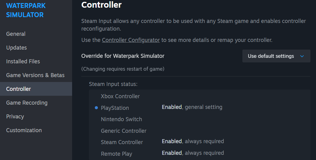 - Full game control support. It should kick in by default, but if for some reason it doesn't, have a look in Steam settings for controller, and to force our controller support, choose "Disable Steam Input" in the override